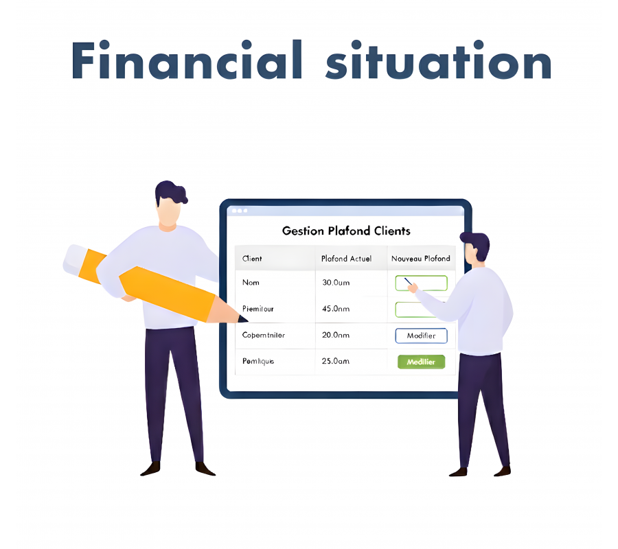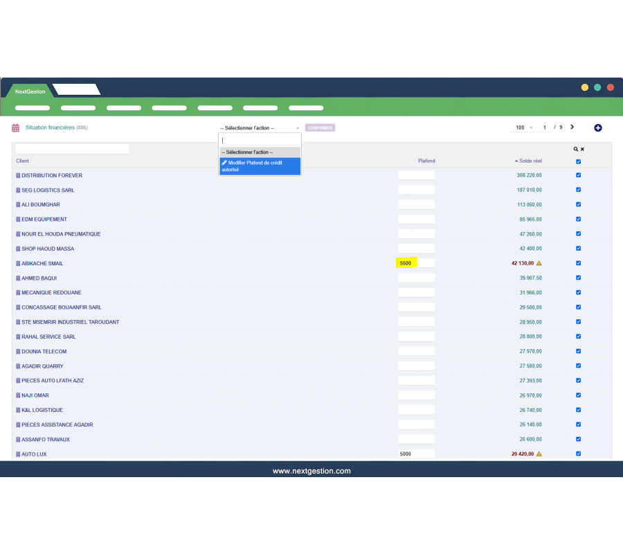 Situation financières centralise, par client, le plafond de crédit autorisé et l’encours réel. La liste signale les dépassements (alerte visuelle), permet la mise à jour des plafonds en ligne ou en masse, propose recherche et pagination, et applique une tolérance configurable (jusqu’à 10 % du plafond, plafonnée). Un outil simple pour piloter risque, relances et décisions de crédit.