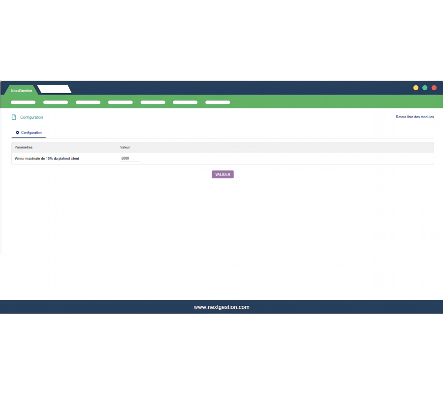 Configuration : écran dédié pour fixer la valeur maximale de la tolérance (ex. 5 000).