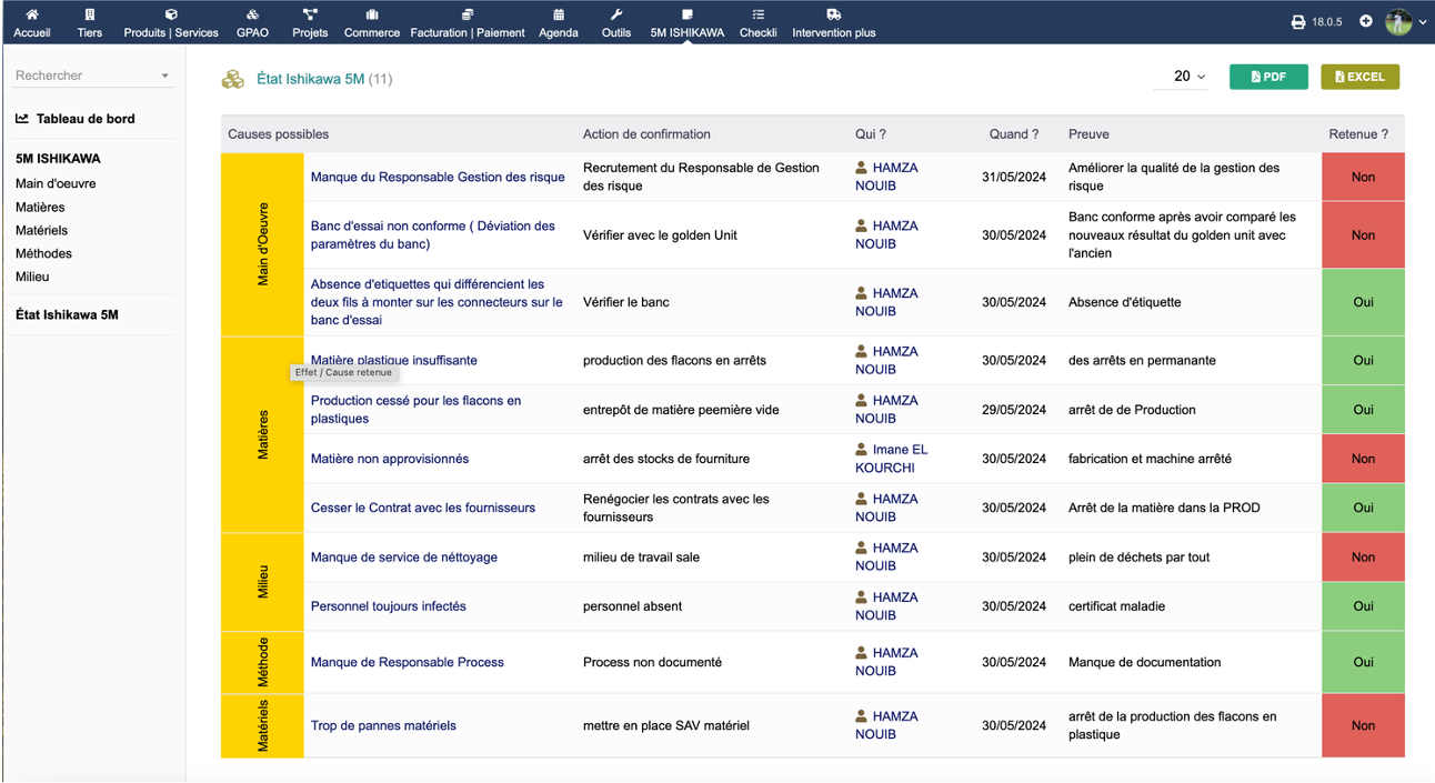 Le diagramme d'Ishikawa, également connu sous le nom de diagramme de cause à effet ou diagramme en arêtes de poisson, est un outil utilisé pour identifier les causes potentielles d'un problème spécifique. Le module 5M ISHIKAWA de Dolibarr utilise cette méthode en se concentrant sur cinq catégories principales de causes : Matériel, Main-d'œuvre, Méthode, Milieu et Matière.
