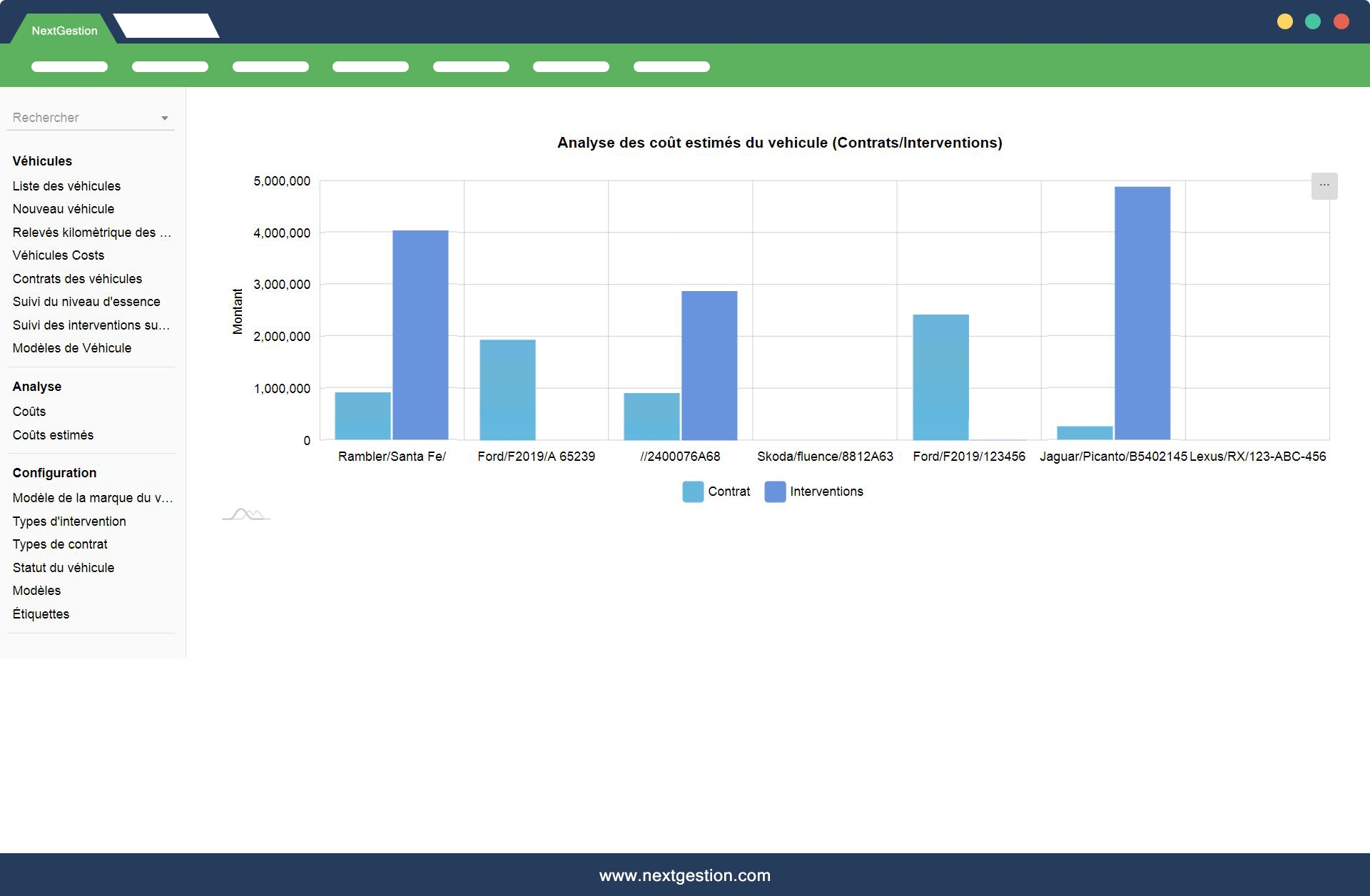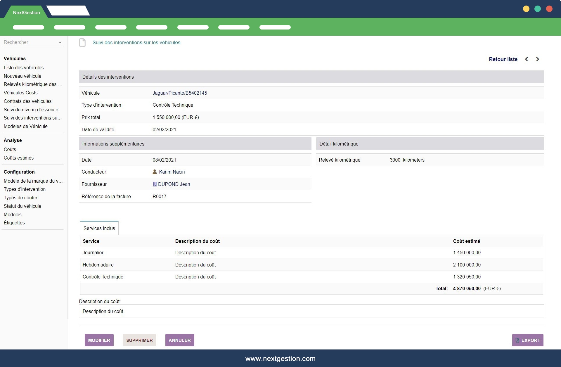 1- Précisez la marque et le modèle, le numéro d'immatriculation, le numéro du chassis, le nombre de portes et de sièges, la couleur, etc, afin d'identifier facilement chacun des véhicules de votre entreprise. Contrats de location 2- Déterminez les dates de début et d'expiration d'un contrat, ses coûts récurrents et d'activation, et son état. Suivez de près le kilométrage 3- Fournit les mesures de l'odomètre, afin de surveiller le kilométrage d'un véhicule, et de prévoir ses réparations et son entretien. 4- Surveillez la consommation de carburant 5- Enregistrez les pleins pour chaque voiture, afin de suivre la consommation de carburant, ou bien liez chaque véhicule à une carte de carburant spécifique, afin d'enregistrer automatiquement les transactions. Entretien du véhicule 6- Obtenez un suivi quotidien des besoins de maintenance de tous les véhicules, afin de prévoir leur entretien, et de garder un oeil sur les réparations. Vue d'ensemble par véhicule 7- Obtenez une vue d'ensemble claire de tous les coûts associés à chaque véhicule. États 8- Créez divers états, afin d'obtenir une vue d'ensemble claire des véhicules commandés, des véhicules à votre disposition, des véhicules que vous ne possédez plus, etc. Rapports et analyses Tableau de bord Obtenez une vue d'ensemble claire de tous vos véhicules grâce aux rapports en temps réel et aux graphiques. Rapports Enregistrez tous les coûts relatifs à votre parc dans un rapport clair et détaillé, et créez un rapport personnalisé contenant toutes les informations dont vous avez besoin. Login: demoMot de Passe: demoSi vous commandez notre module vous bénéficiez de: