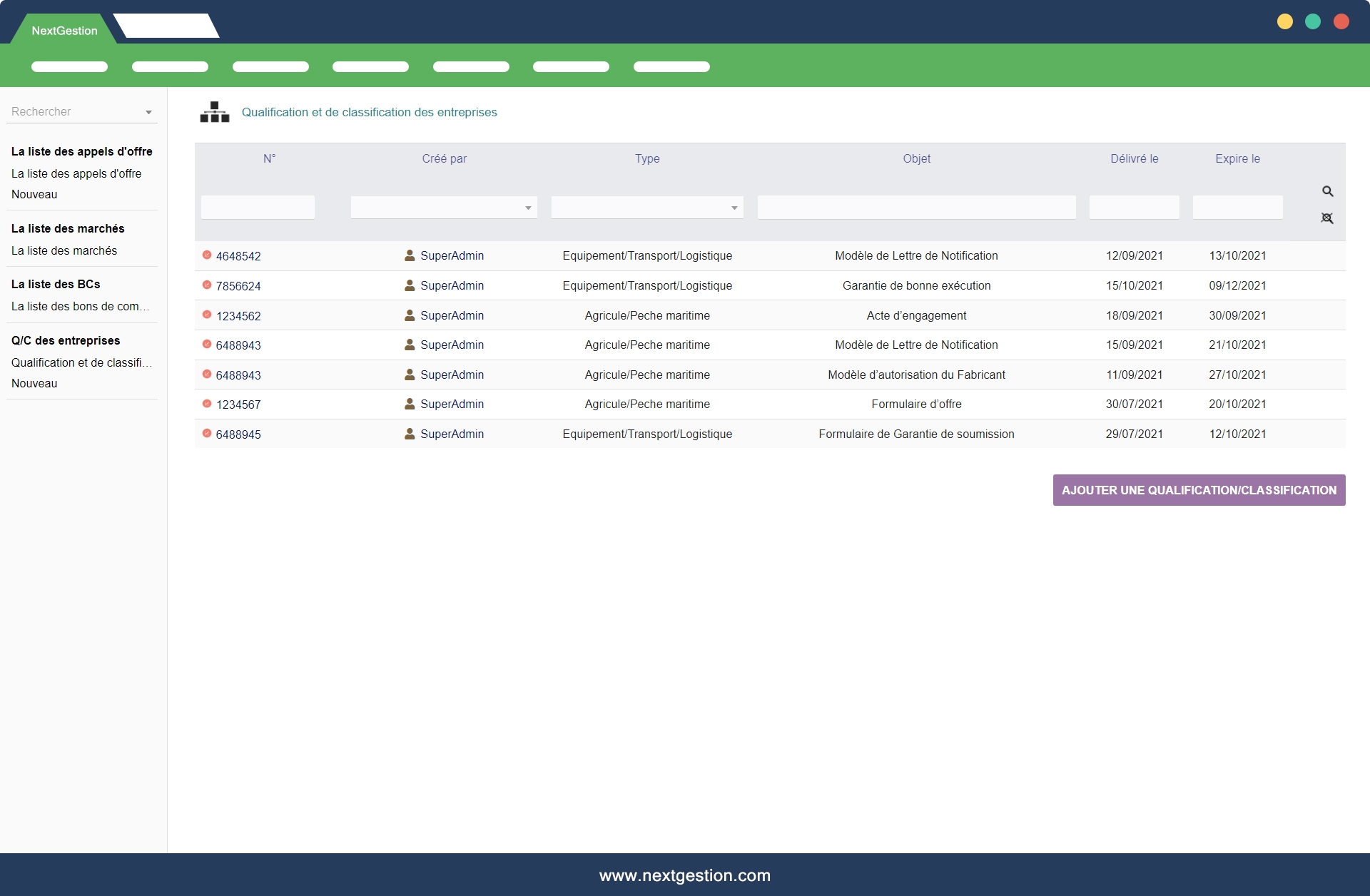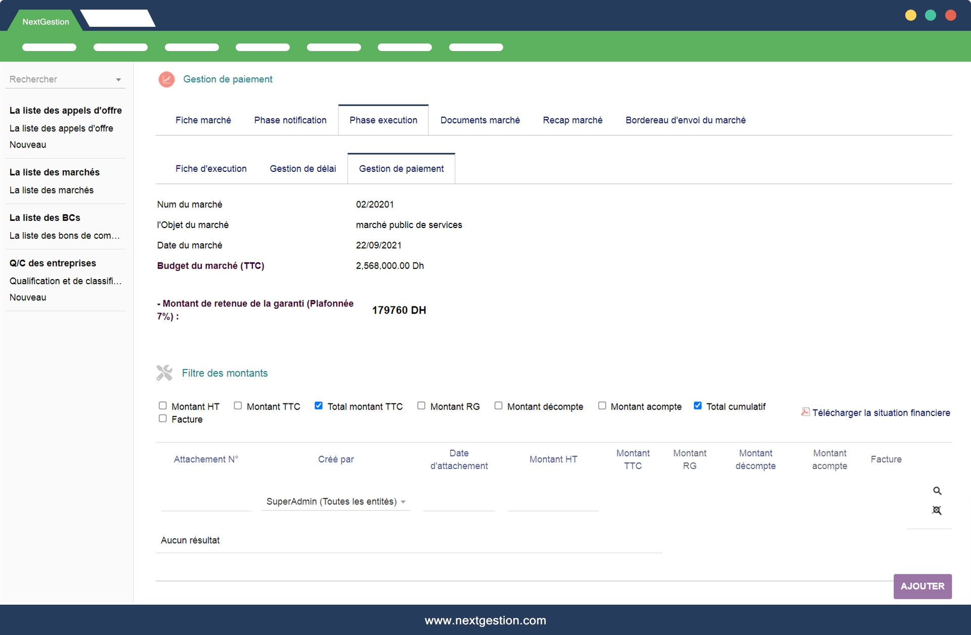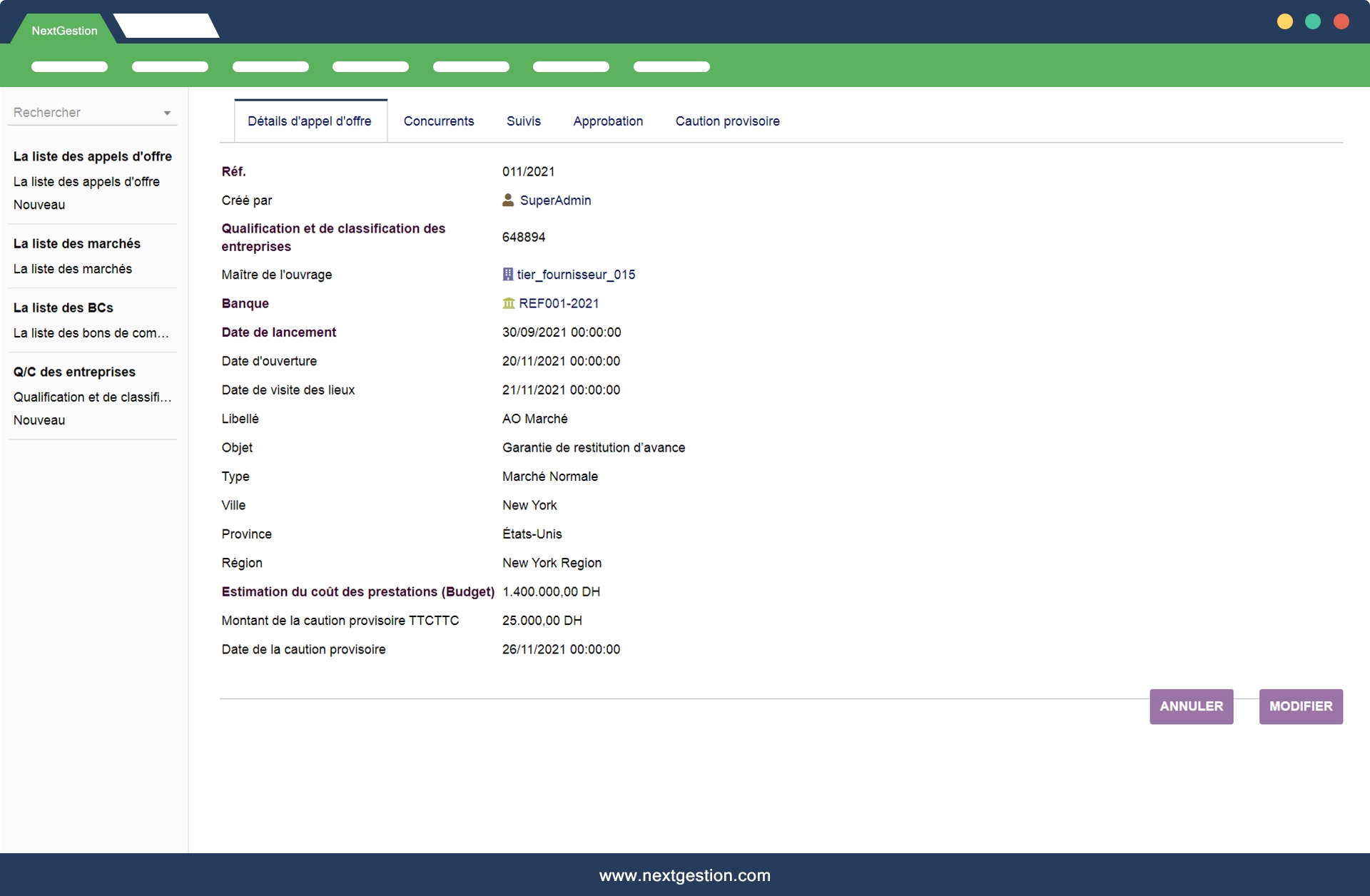 Le module de gestion des marchés public, les appels d'offres et les bons de commande permet de simplifier la gestion des marchés de la phase appel d'offre jusqu'à la réception définitive de marché. vous trouverez dans ce module la gestion des appels d'offres, des concurrents, l'adjudicataire, les bordereaux et les cautions et de marché avec ORDRES DE SERVICES, LES DÉCOMPTES ET LES ATTACHEMENTS.
