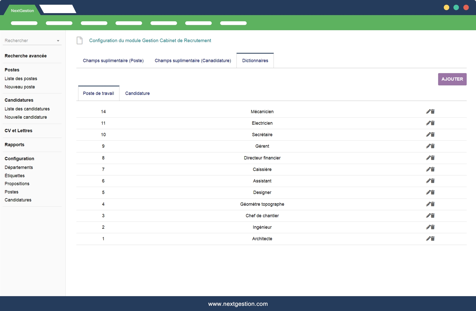 Le Module TALENT: GESTION DE CABINET DE RECRUTEMENT vous permets de gérer l'activité de recrutement au sein de votre structure soit en interne soit en externe pour d'autes société si vous êtes recruteurs ou chasseurs de tête. Le module vous permet de: - gérer les recrtuements pour votre cabinet de recrutement; - Lancer des postes que vous cherchez; - trouver et saisir les candidatures de chaque poste; - saisir toutes les informations sur un profil: Exépriences professionnelles, niveau d'études, infos personnelles, CV, lettre de motivation, déparetement, ville ...etc - saisir le responsable de recrutement; - génerer la liste des candidatures de chaque poste; - ajouter librement des champs suplémentaires: possibilité de disposer des fonctions d’extra Fields sur les formulaires « Postes » et « Candidature », - le module est adaptable sur votre propre activité grâce à l'outil et fonctions d’extra Fields; - saisir les chargé de mission; - outil de recherche avancée sur le module: qui vous permet de cherchez les candidatures, les postes ou les jobs, ou par ville, département, ou par niveau d'études, ville d'origine, les outils techniques maîtrisé...etc - vous disposez d'un moteur de recherche avancée sur la base de module. Si vous commandez notre module vous bénéficiez de: