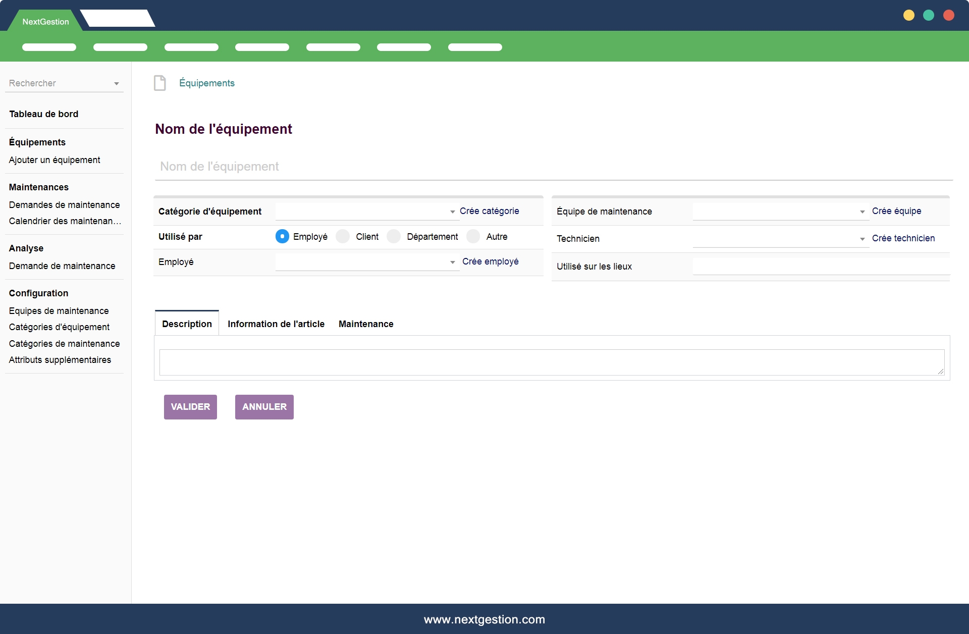 - Vous permet de configurer les articles / articles qui seront utilisés dans le formulaire Demande de maintenance sur équipement.