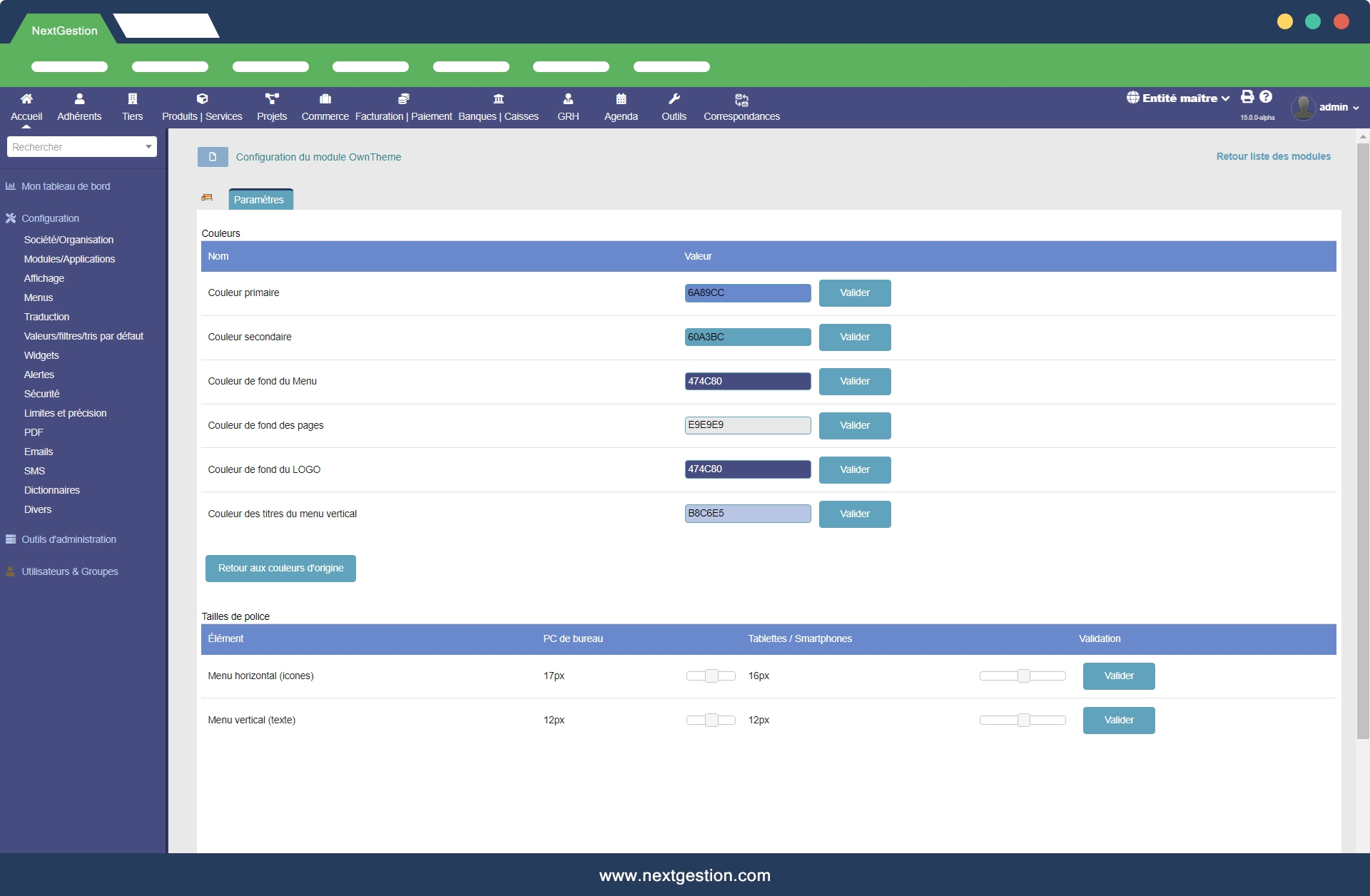 Le nouveau Thème Multi-couleur "OwnTheme", doté avec affichage Responsive, vous permet de changer le style et les couleurs de Dolibarr complètement, il est adapté à toute les dispositifs informatiques de différentes tailles: PC bureau, Laptop, Smartphone, tablette. nous avons intégrés des couleurs, boutons et styles professionnels et élégant afin de faciliter la navigation de votre intranet.