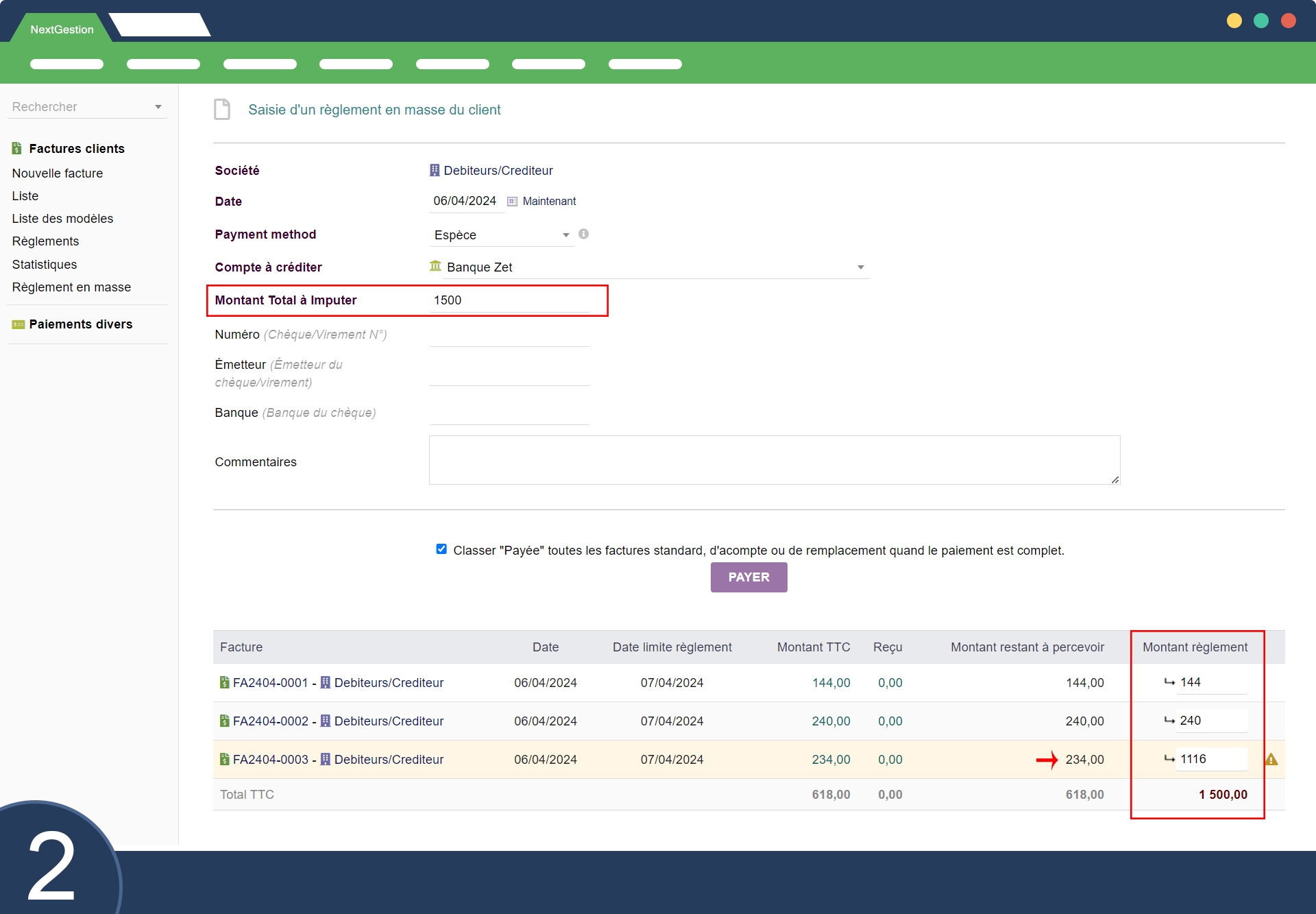 Abbiamo sviluppato nel modulo un menu a livello di fatturazione del pagamento che consente il pagamento massivo (Pagamento massivo cliente / Pagamento massivo fornitore).