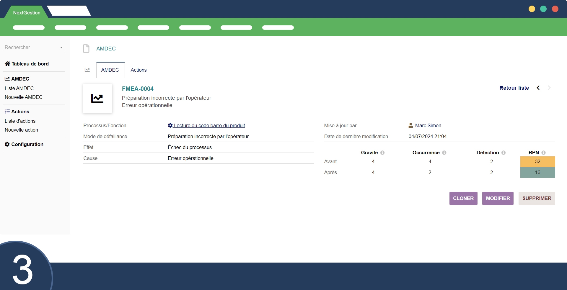 Modulo di analisi del rischio AMDEC o FMEA. Rileva le modalità di guasto e pianifica azioni preventive con il modello FMEA. Cruscotto dinamico incluso. Tutto pronto per la stampa.